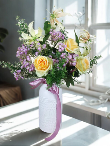 ur "Golden Beauty" display, full of soft pink and elegant yellow tones, is softened further with the addition of green foliage. A simply beautiful bouquet that is sure to brighten everyone's day. This bouquet is perfect for a counter top or even as a wedding bouquet.
