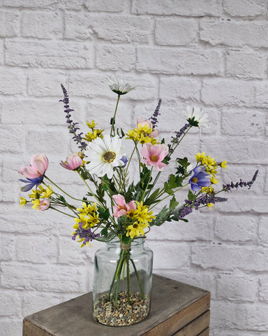 Country Garden is a cheerful, softly gathered bouquet of yellow mini daisies, pink and purple cosmos, and lavender. Inspired by rambling garden borders, it brings relaxed countryside charm into your home all year round.